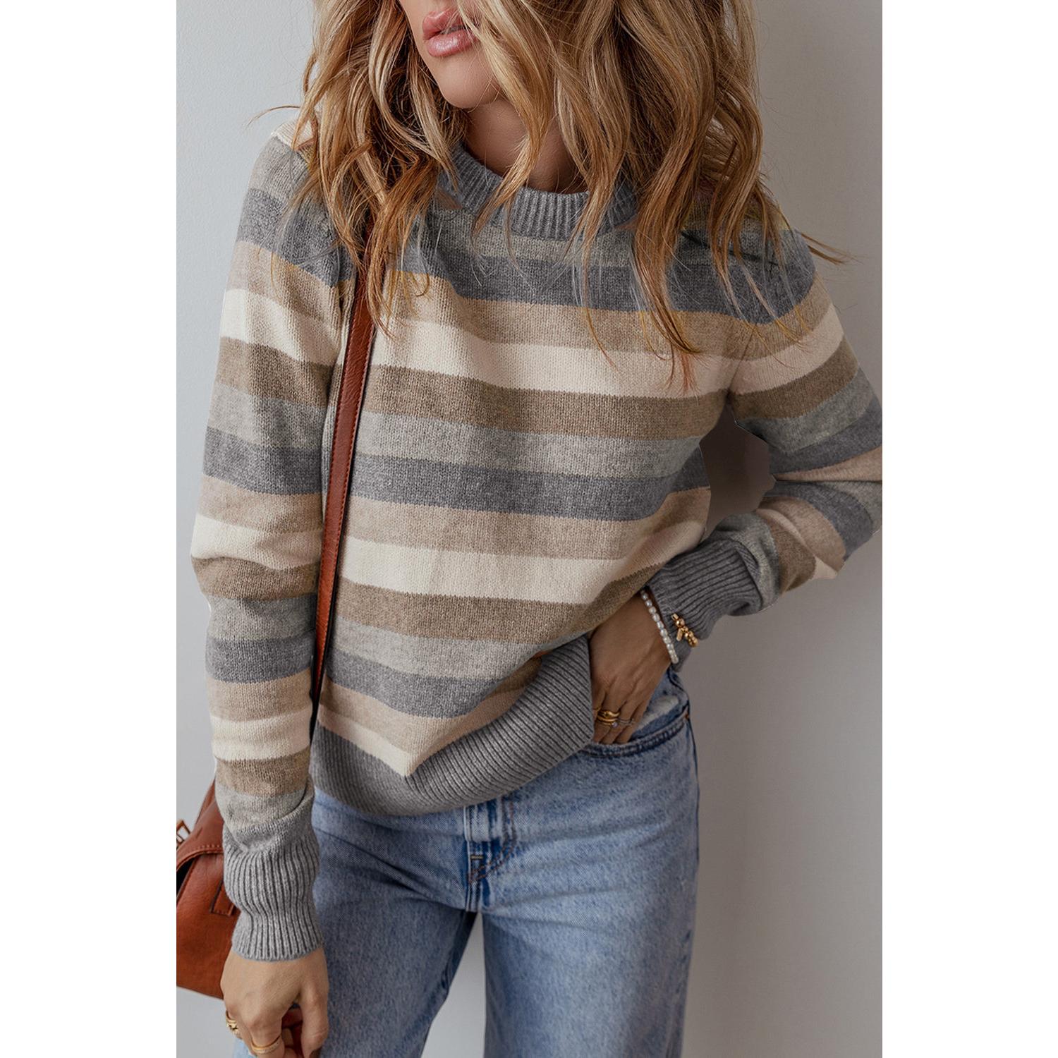 Gray Stripe Color Block Ribbed Edge Round Neck Sweater