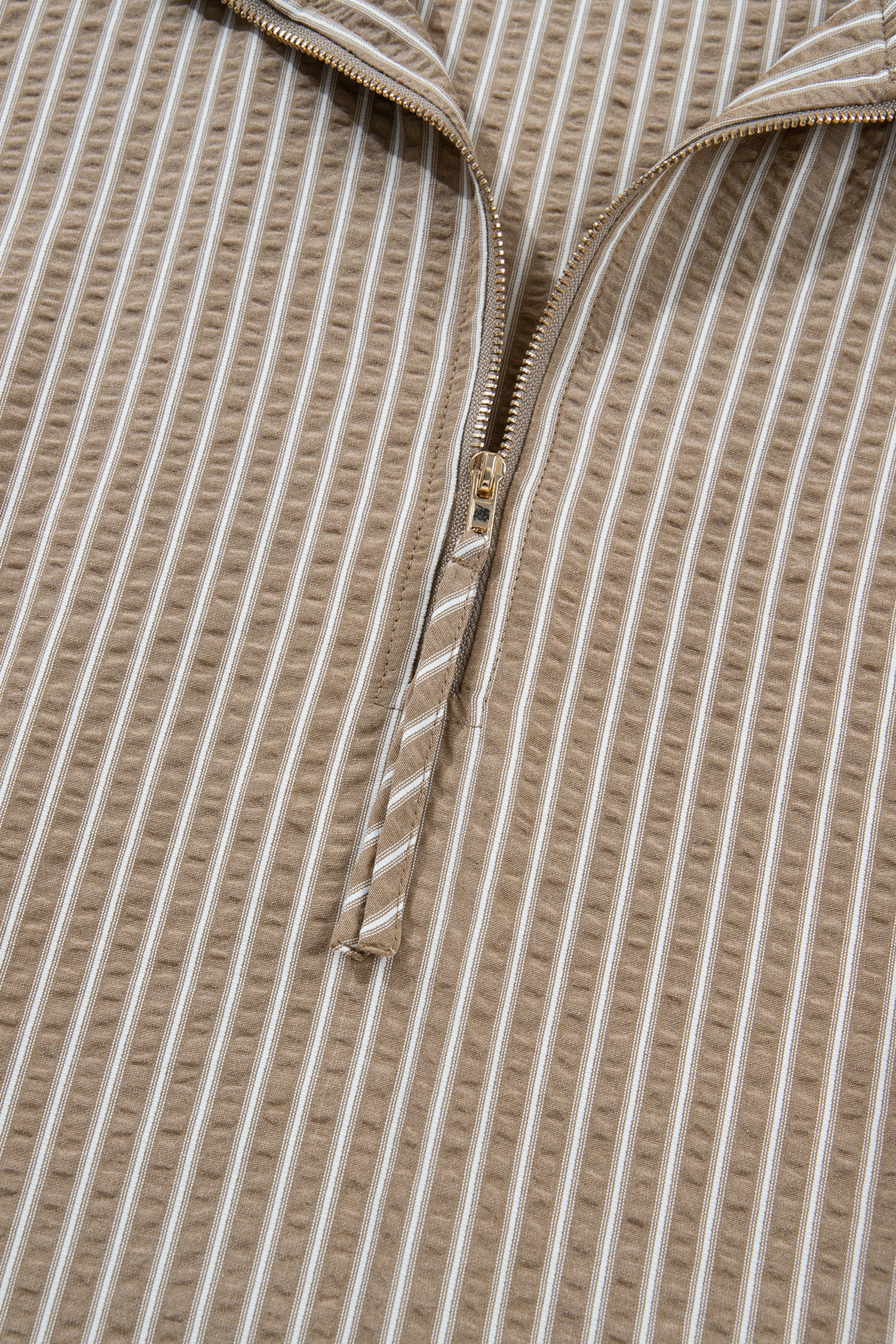 Khaki Stripe Zip up Collared Puff Sleeve Ruffled Plus Size Mini Dress