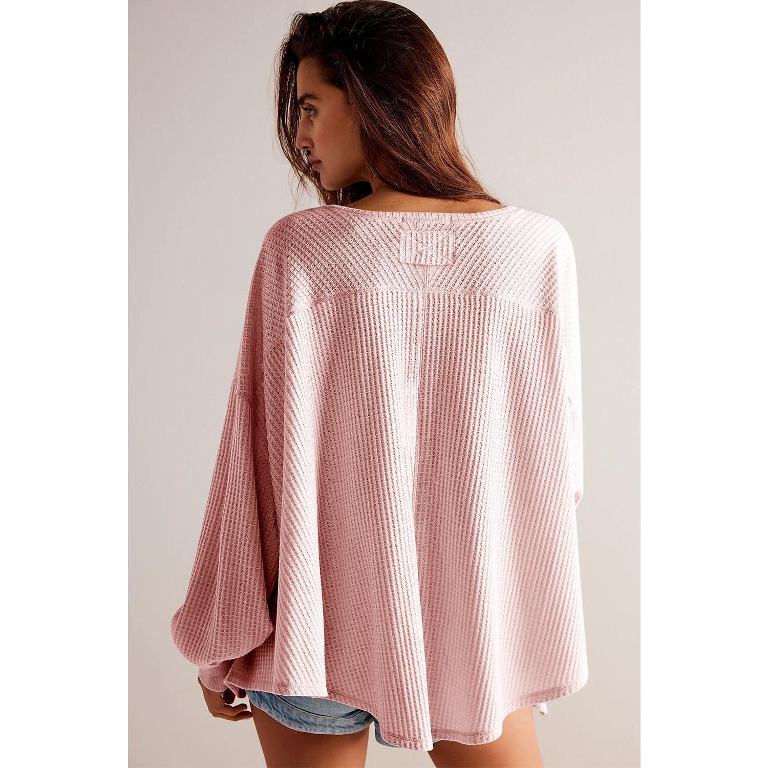Light Pink Waffle V Neck Long Sleeve Drop Shoulder Loose Blouse Shirts Top