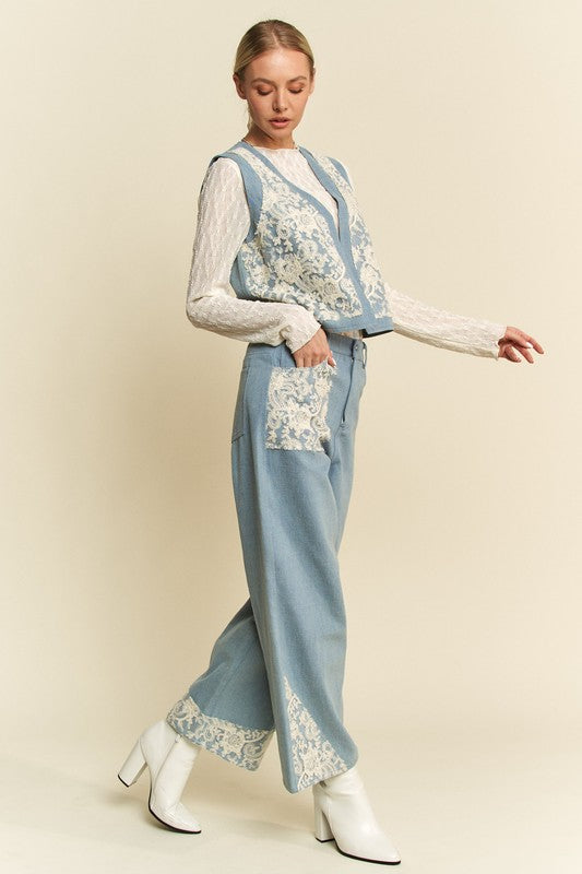 The Lace Patch Open Front Denim Vest is a trendy and stylish garment featuring lace accents for a feminine touch. The open front design adds a modern and versatile element to the vest. Made from denim material, this vest offers a casual yet chic look that can be dressed up or down. Perfect for layering over tops and dresses, the denim vest with lace patch detailing adds a fashionable twist to any outfit.