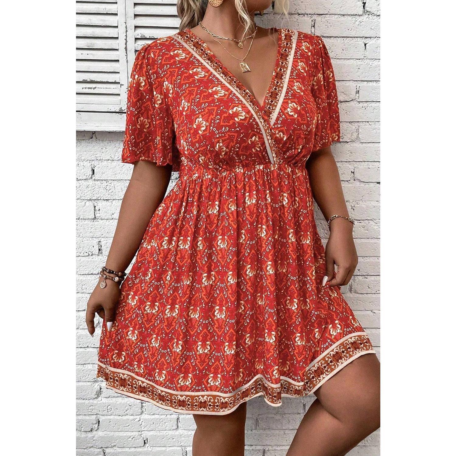 Orange Plus Size Printed Surplice Neck Empire Waist Flowy Mini Dress