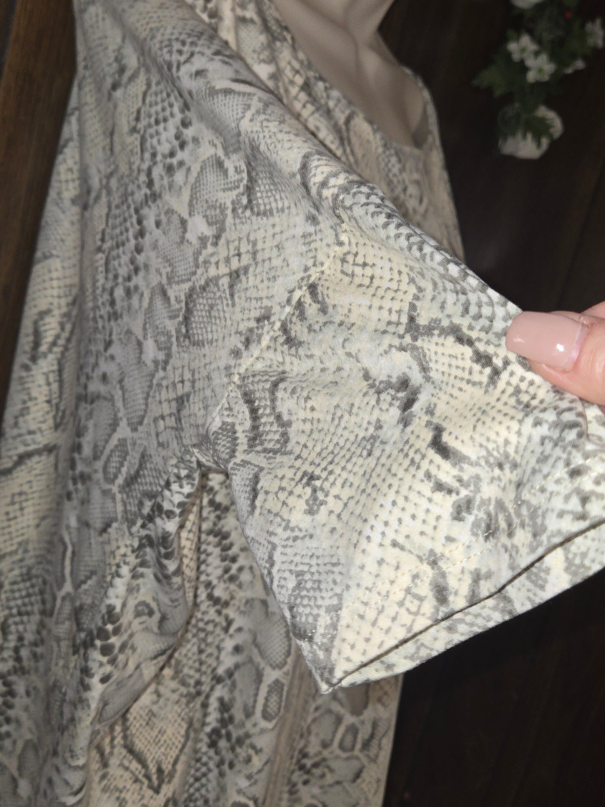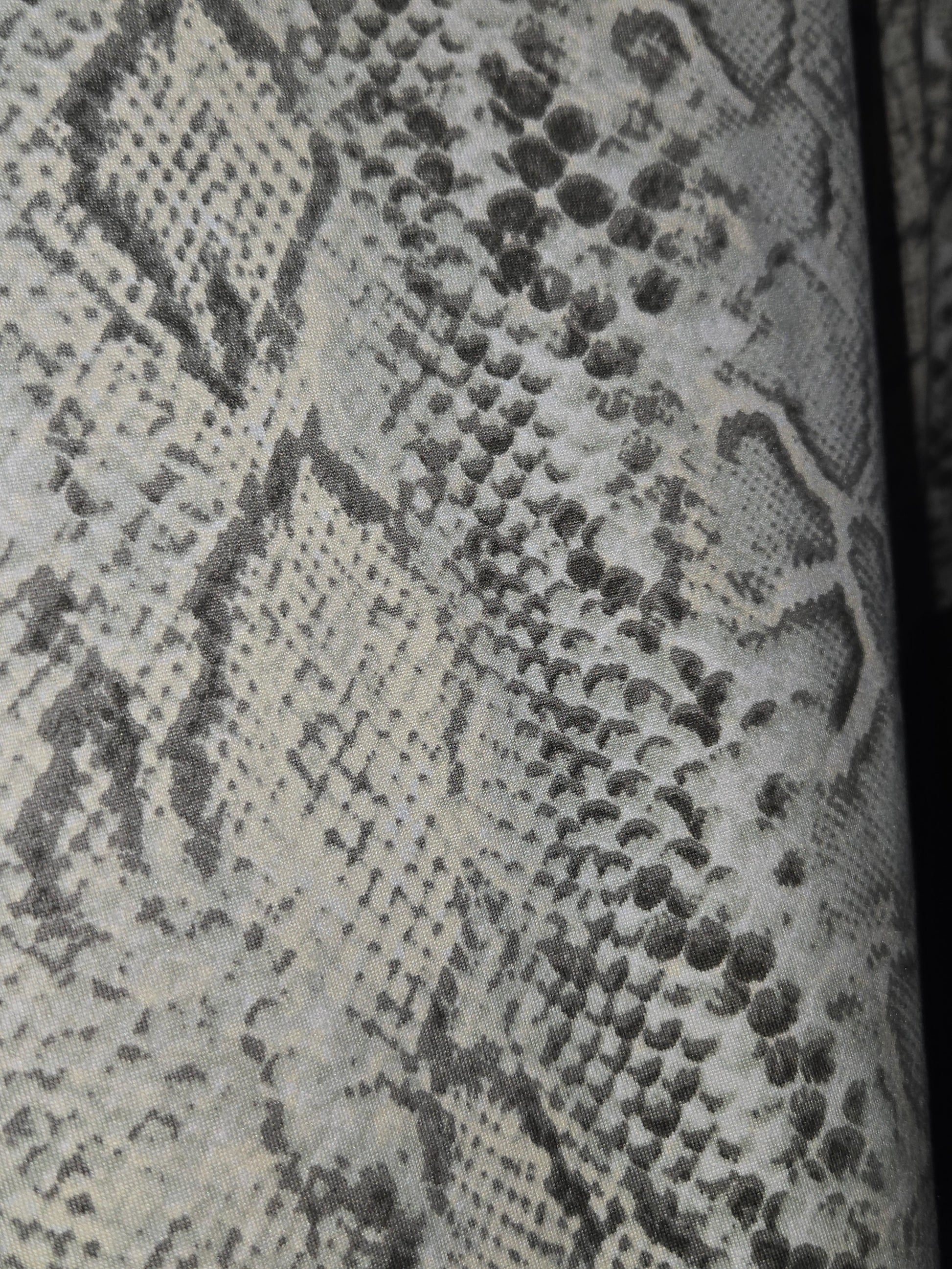designed in a relaxed silhouette, this piece combines bold style with effortless comfort. the neutral gray , cream and black snakeskin pattern makes it a versatile statement piece that can be worn casual or dressed up.