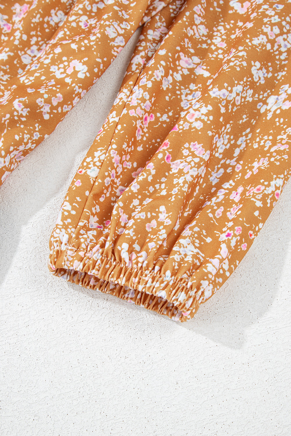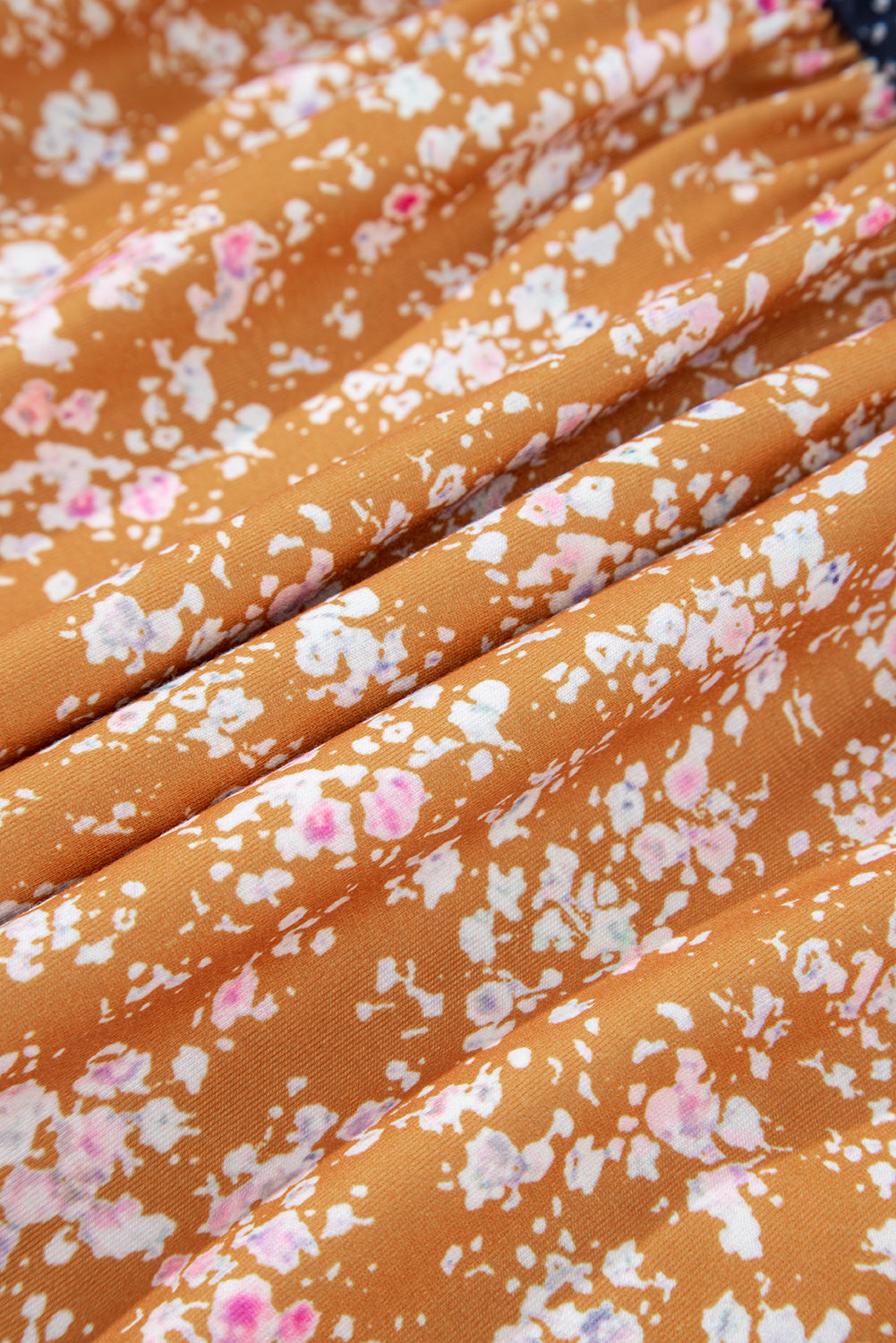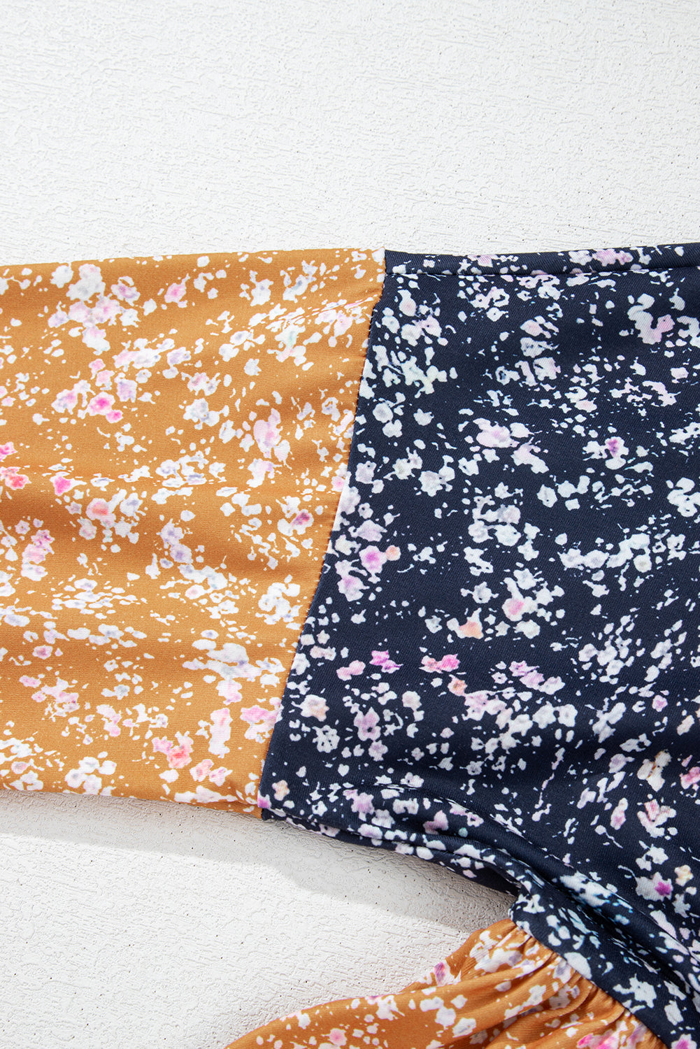 Blue Floral Color Block Patchwork Ruffled Hem Round Neck Blouse