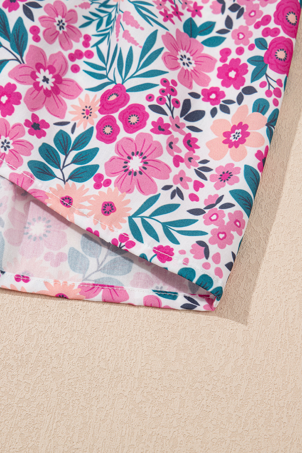 Pink Floral Collared Half Placket Short Sleeve Loose Dress