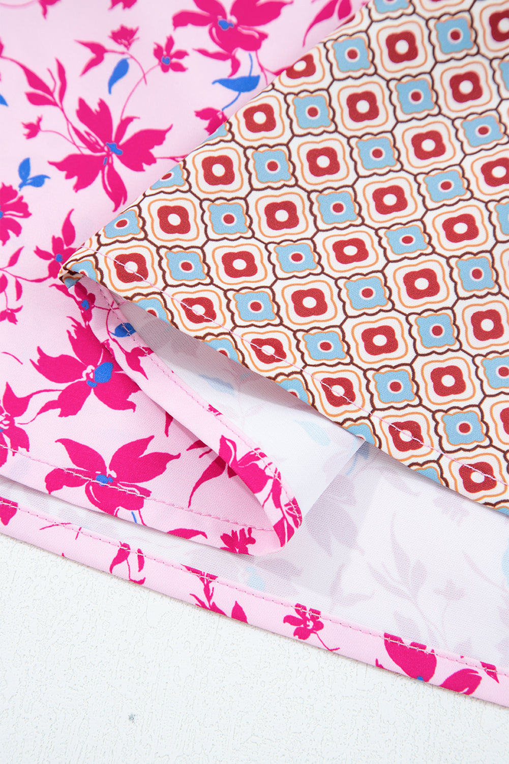 Pink Boho Mixed Floral Drop Shoulder Bubble Sleeve Blouse