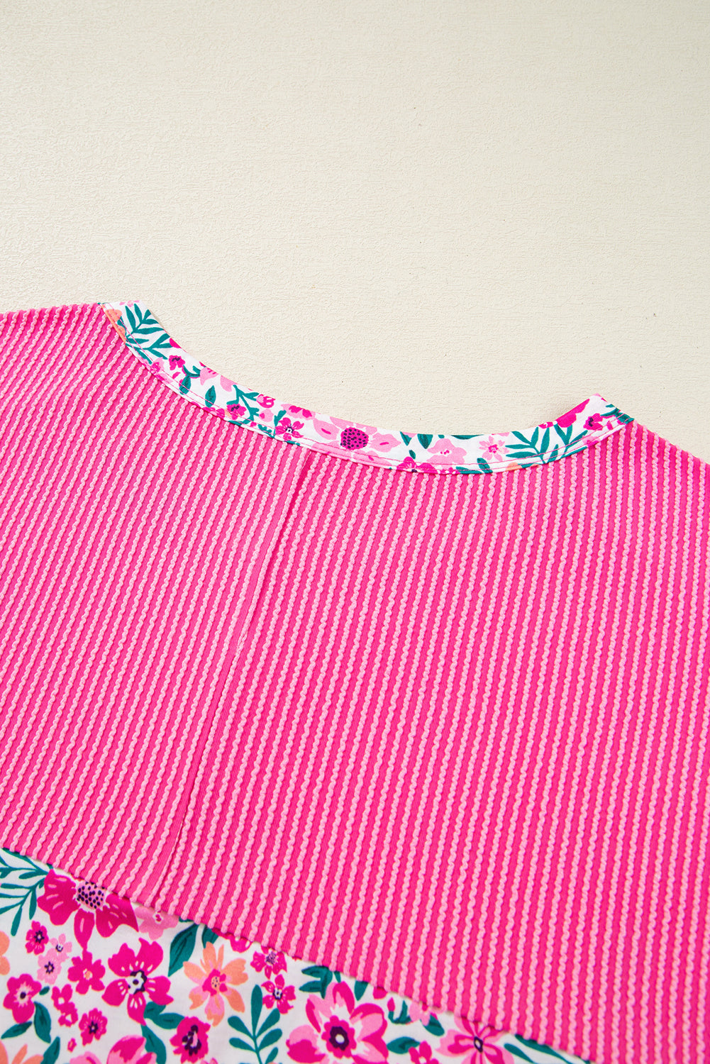 Pink Plus Size Floral Print Corded Patchwork Loose Top