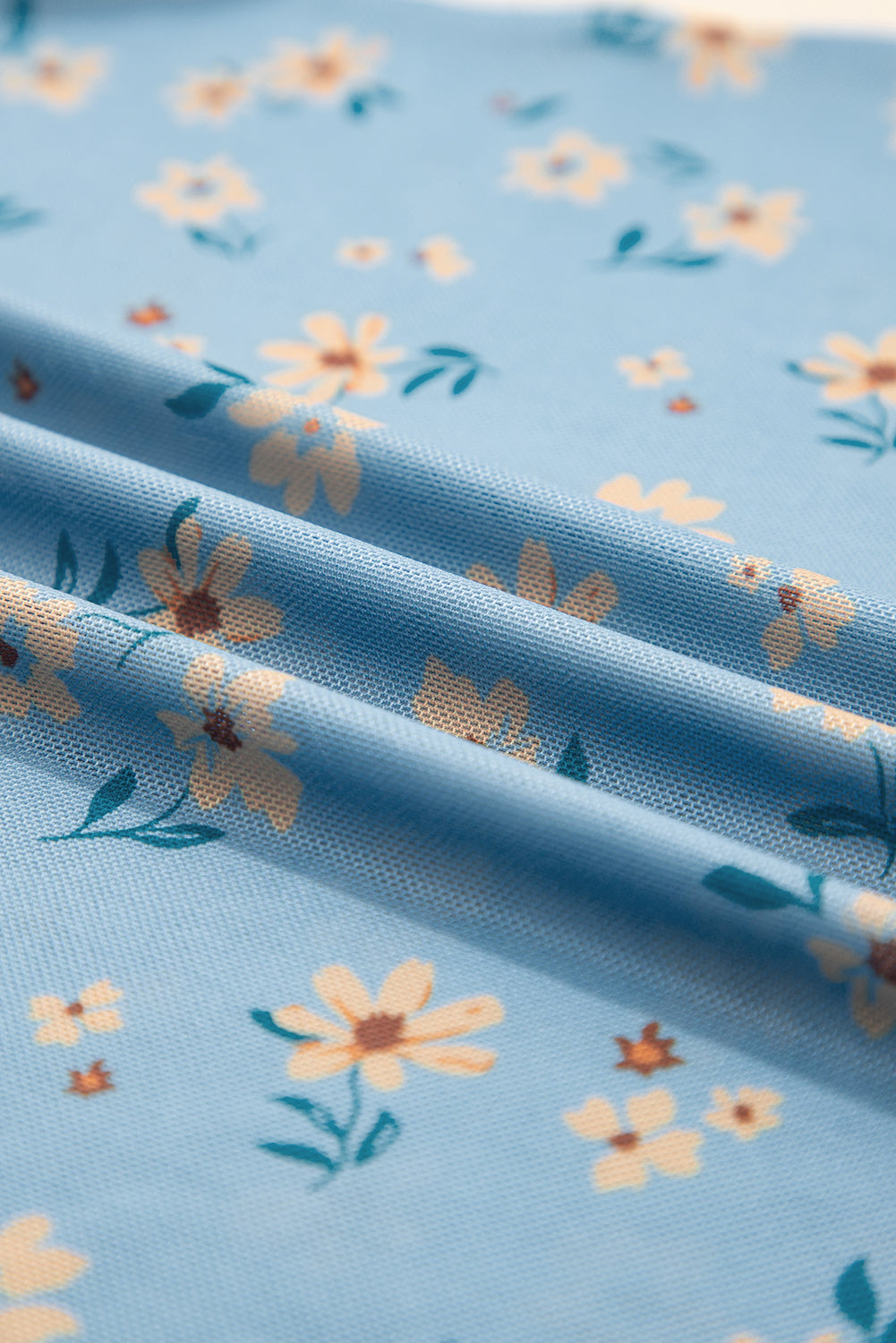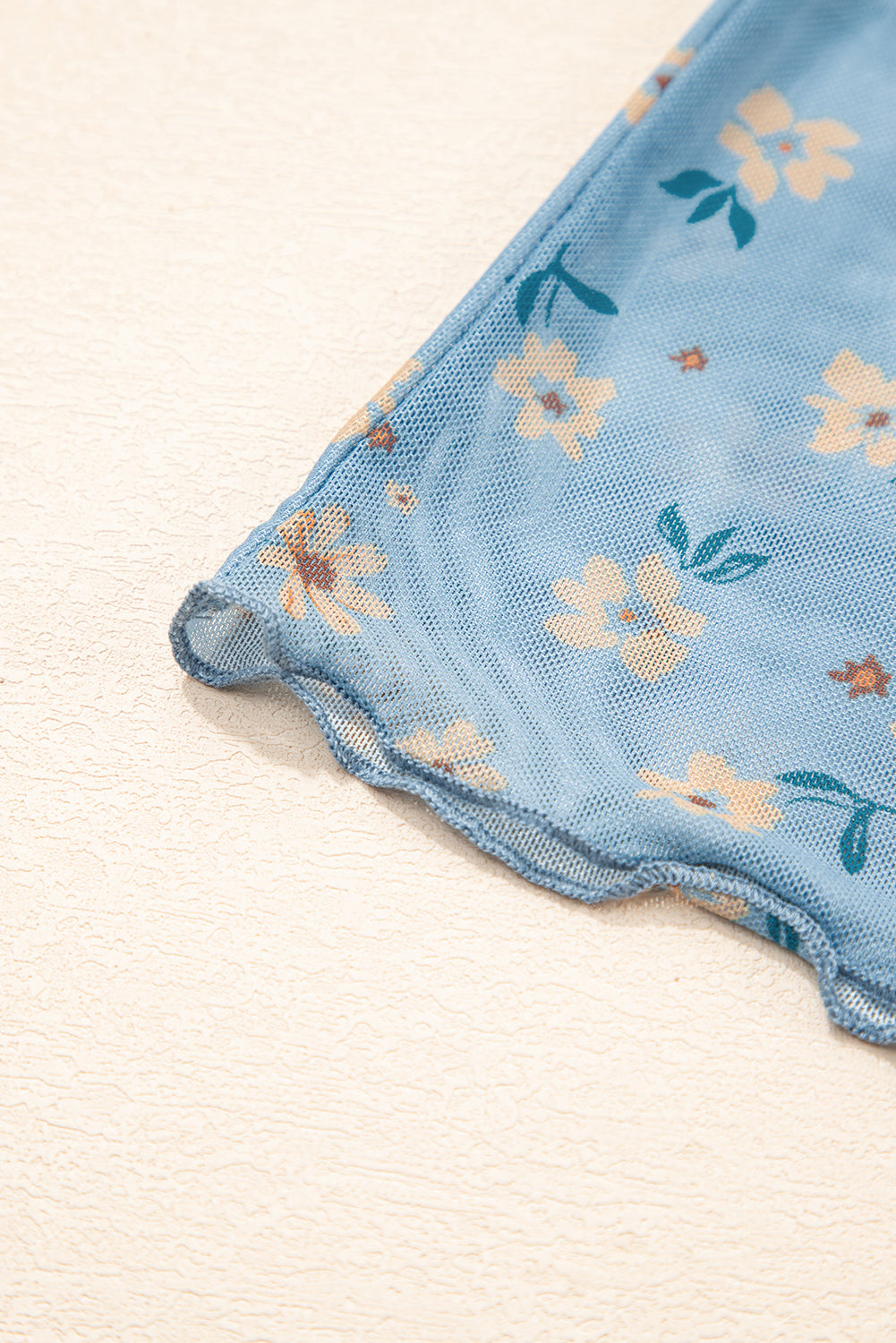Sky Blue Vintage Floral Print Southern Style Mesh Long Sleeve Top