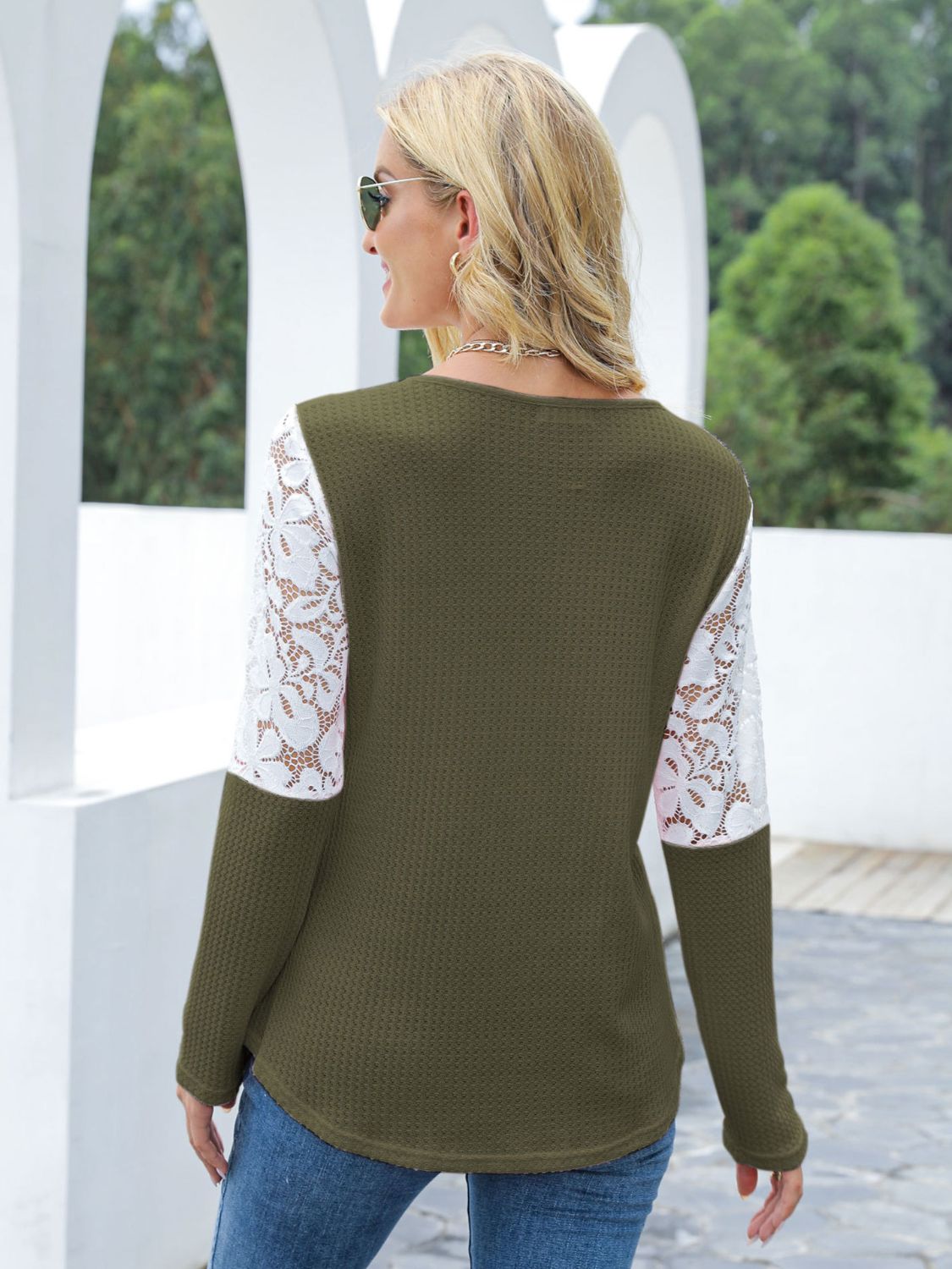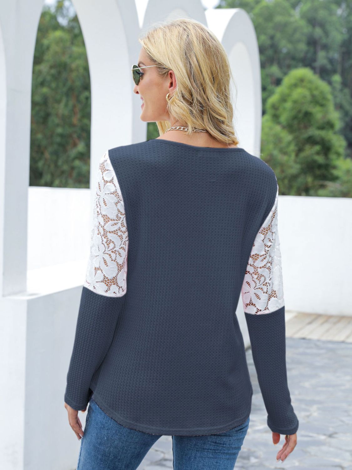 Waffle-Knit Lace Round Neck Long Sleeve T-Shirt