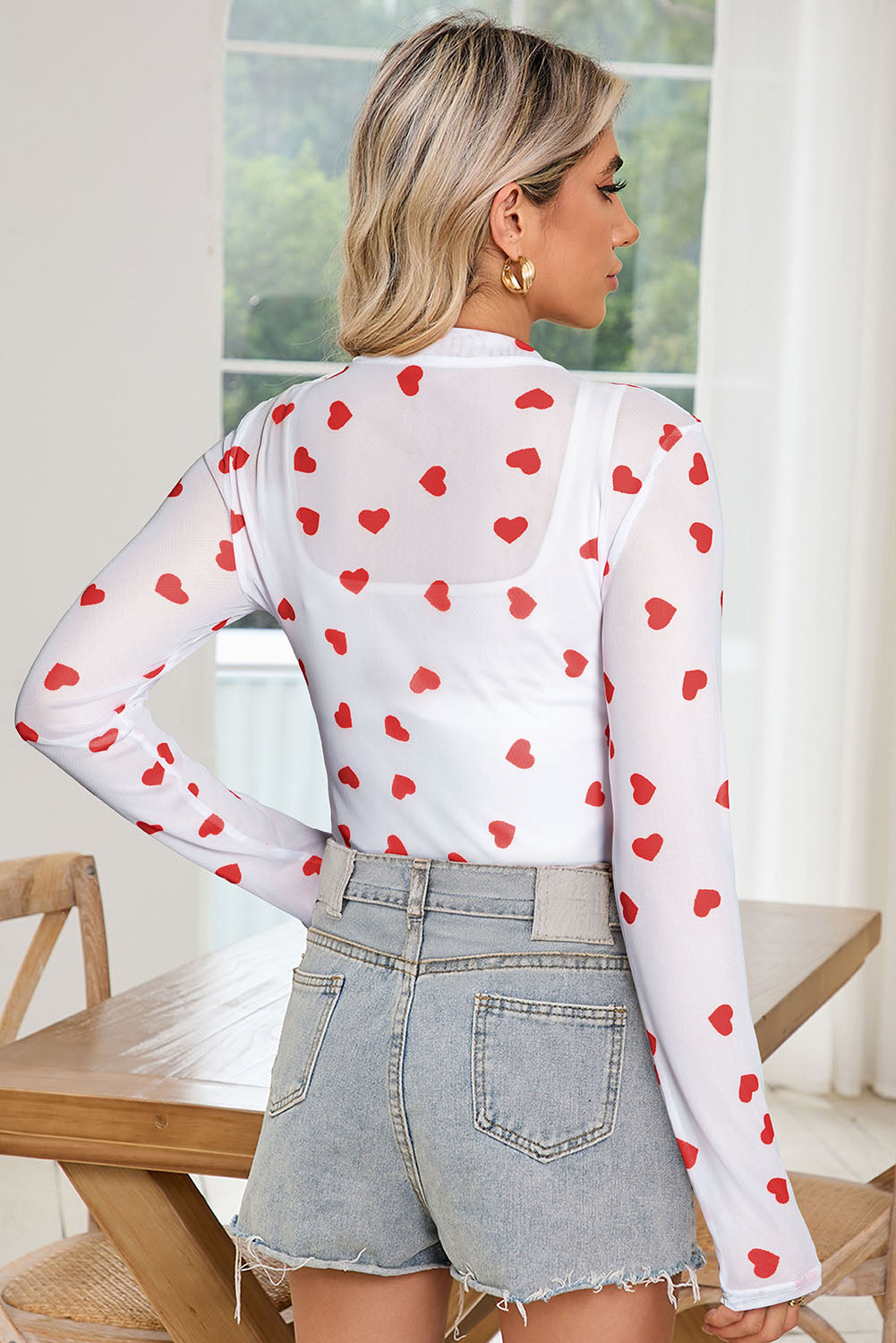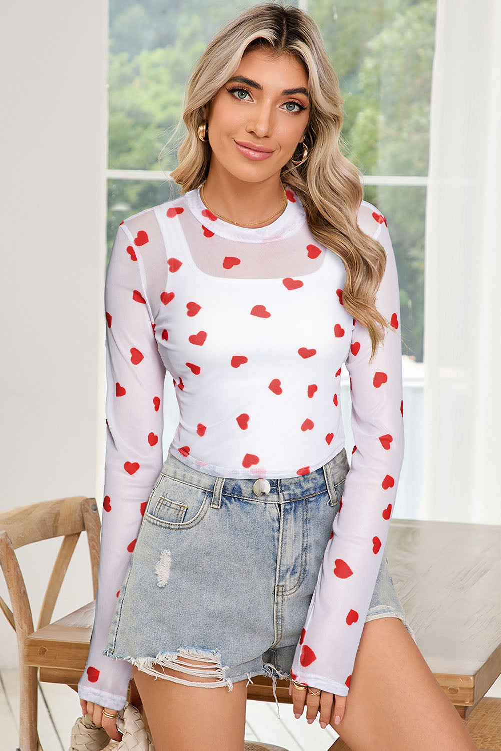 Elevate your casual wardrobe with the White Heart Print Mesh Long Sleeve Top. This charming piece features a delicate heart pattern, adding a sweet twist to your outfit. Made from breathable mesh fabric, it offers a light and comfortable feel, perfect for layering or wearing solo. The long sleeves provide extra coverage, making it versatile for any season. Effortlessly pair this top with your favourite bottoms for a trendy and youthful look, ideal for transitioning from day to night. A must-have for those seeking casual elegance.