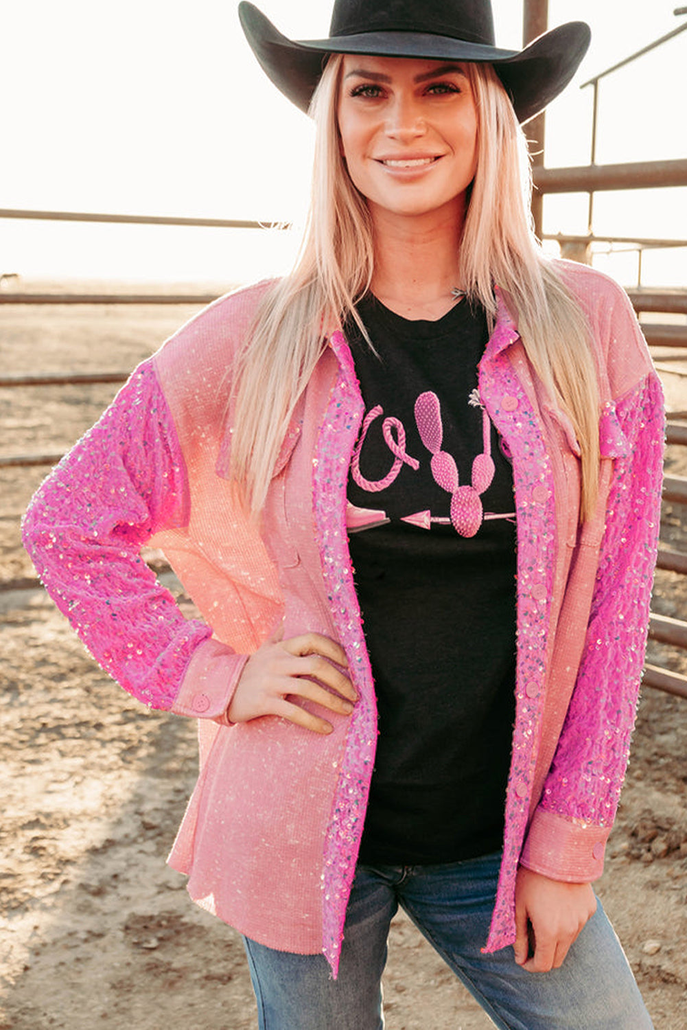 Apricot Pink Mineral Wash Sequin Patchwork Flap Pocket Shacket