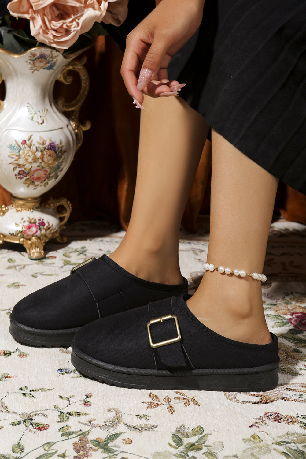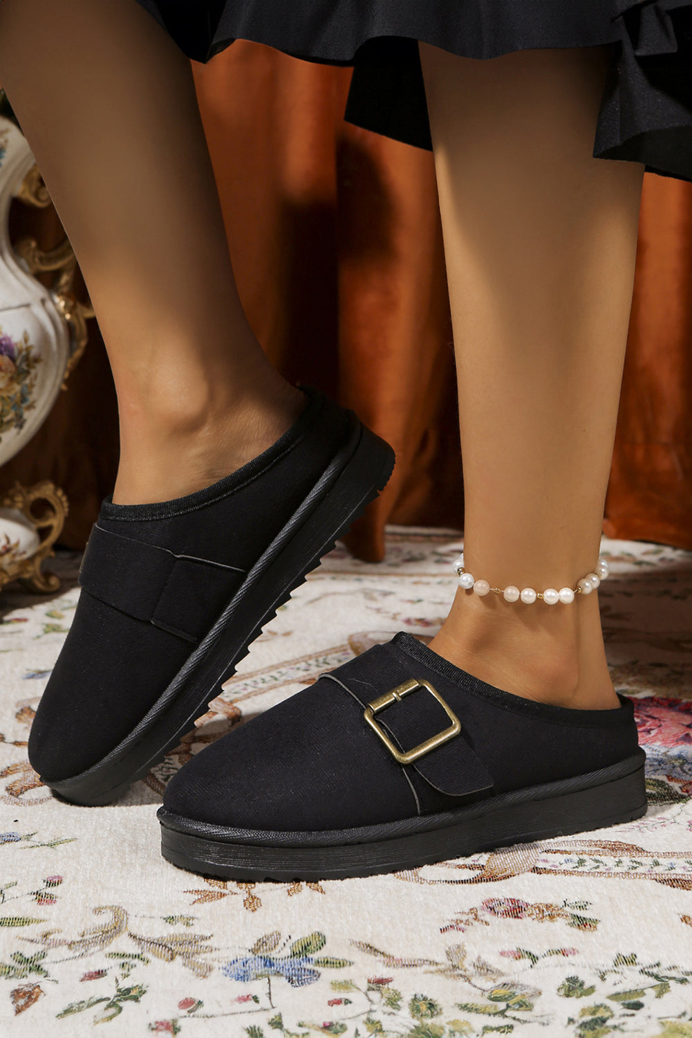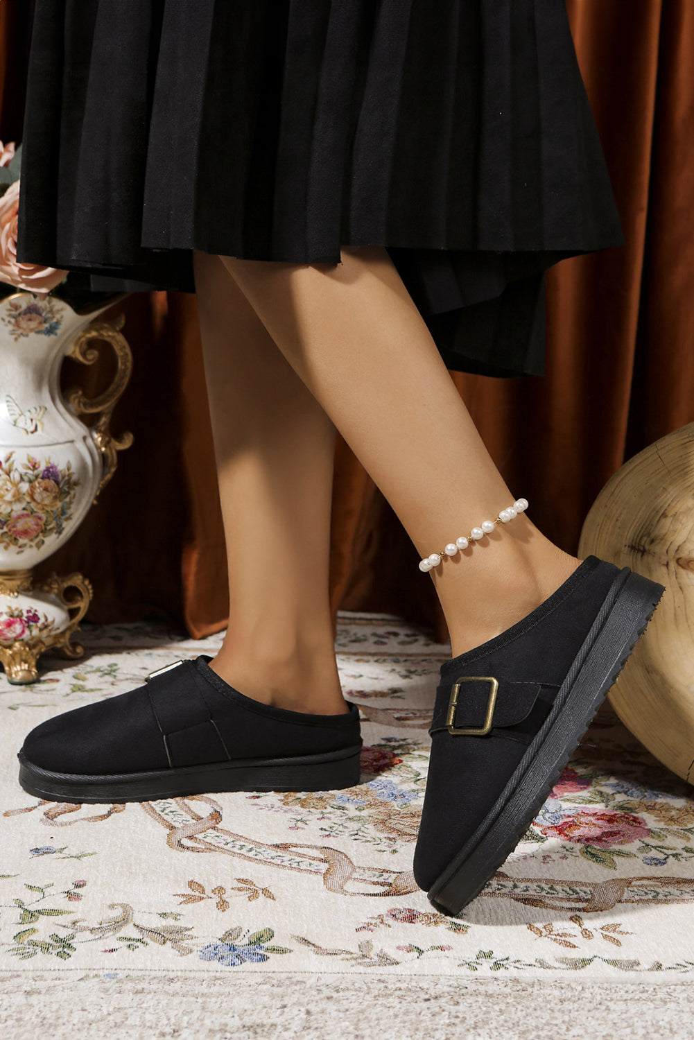 Black Faux Suede Buckle Strap Detail Winter Clog Slippers