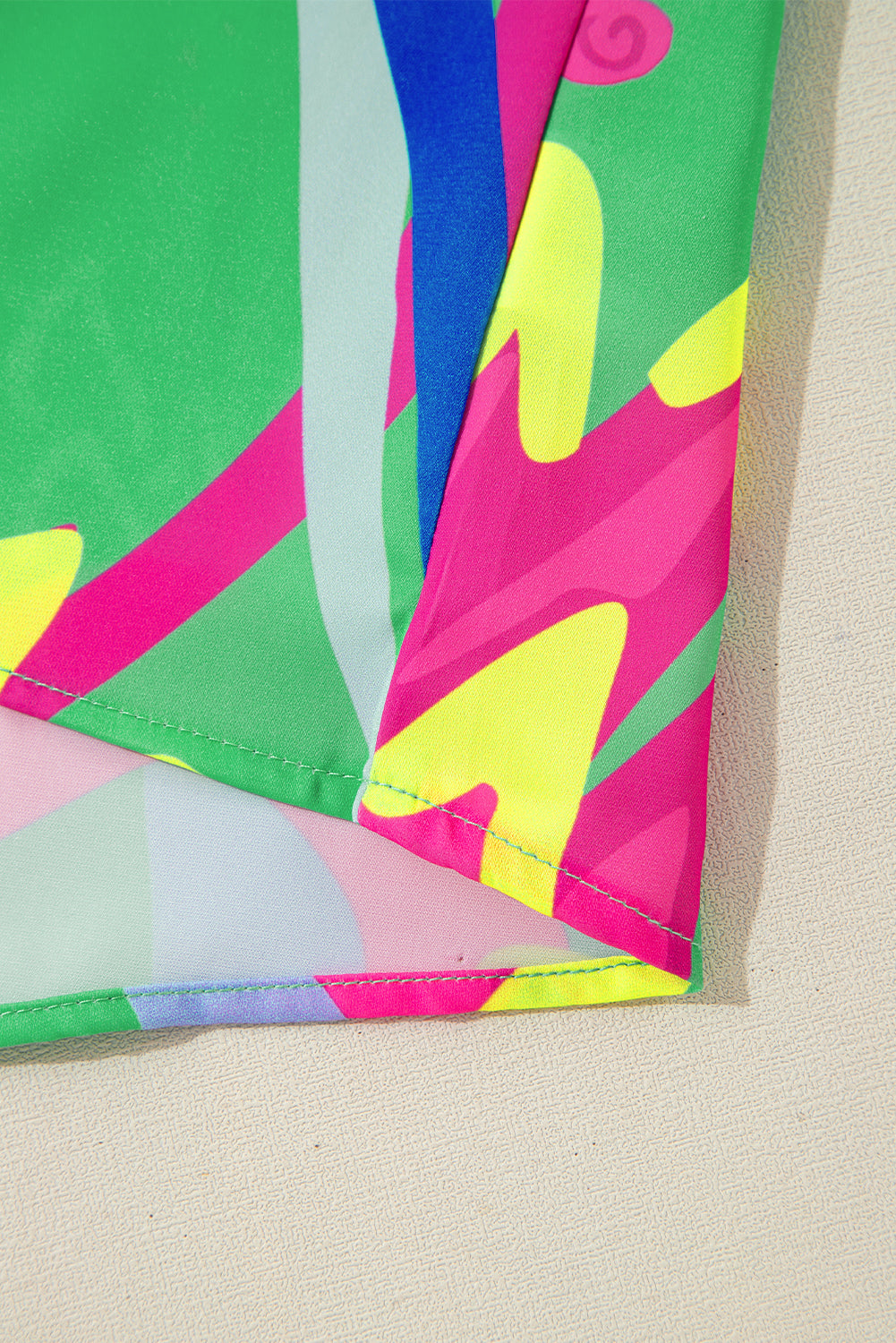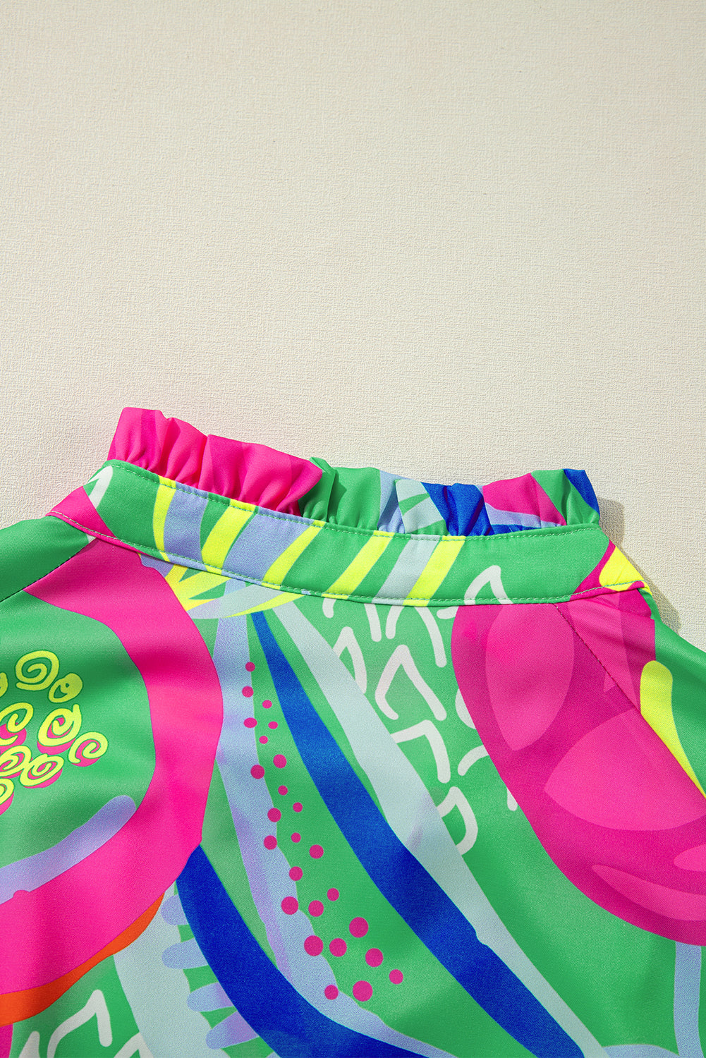 Green Abstract Print Ruffled Sleeve Buttoned V Neck Blouse